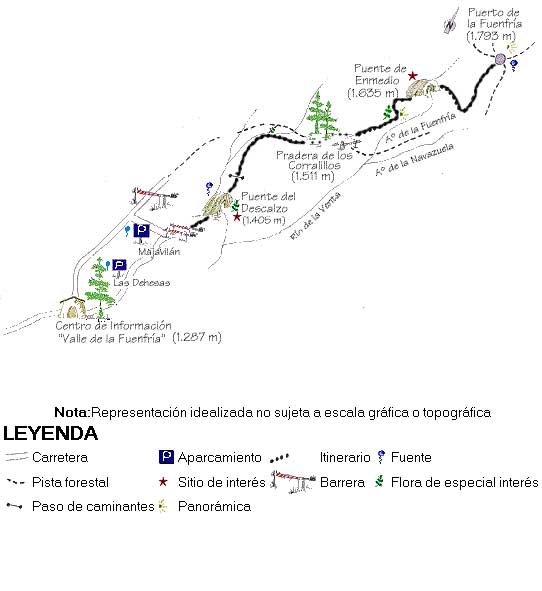 Km 0 Se inicia en el Centro de Información "Valle de la Fuenfría". Desde aquí se ha de coger un camino que sale frente a dicho centro y que lleva al Hospital de la Fuenfría. Dejándolo a la izquierda atravesamos un paso para caminantes. En pocos minutos se alcanza un claro, llamado "Plaza de España", por donde pasa el Camino Viejo de Segovia, que tomamos hacia la derecha. Después de cruzar el arroyo del Infierno, encontramos una casa forestal, bordeando su cerca y cruzando un paso para caminantes, retomamos el camino. Éste cruza dos arroyos, el de Pinolubero primero y, más tarde, el de Majavilán. Continuamos la vereda hasta tomar una desviación a la izquierda. Se trata de la Vereda del Poyal de la Garganta, que salva una fuerte pendiente hasta llegar a un claro desde donde se divisa la vertiente oriental del Valle de la Fuenfría.